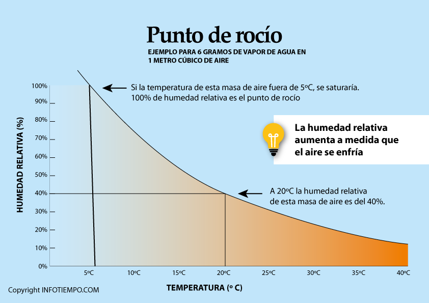Cuando una masa de aire húmedo se enfría, su capacidad para retener vapor de agua disminuye. La temperatura a la cual el aire se satura por completo, y por debajo de la cual el exceso de vapor debe cambiar de estado, se denomina punto de rocío (o $T_{d}$).